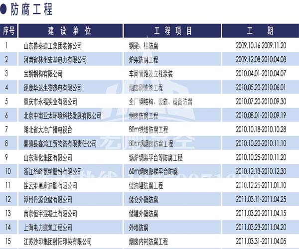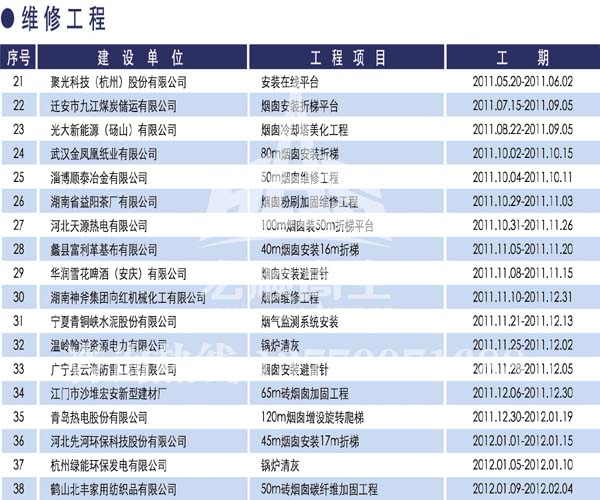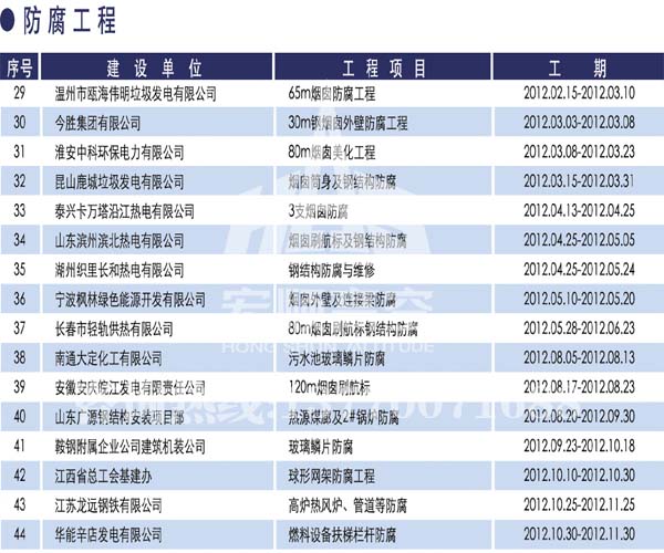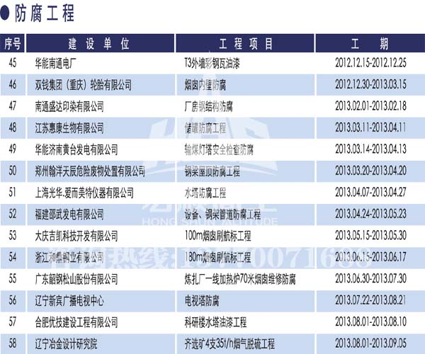 宏順建設(shè)工程有限公司是國家批準(zhǔn)成立的專業(yè)高空作業(yè)企業(yè):承攬過(國內(nèi).國外)煙囪新建、煙囪防腐、吊機(jī)防腐、水塔防腐、管道防腐、龍門吊防腐、儲存罐防腐、煙囪內(nèi)壁防腐等高空作業(yè)工程。具有“不搭腳手架 、 不需要停產(chǎn)”施工特點(diǎn)。